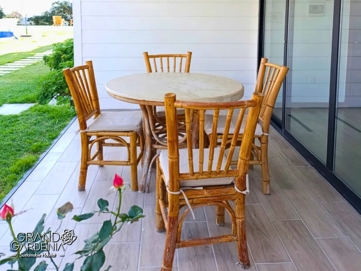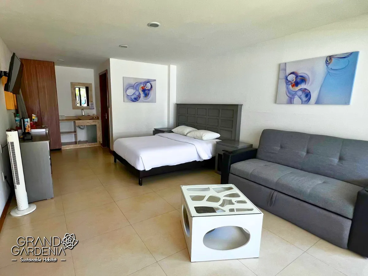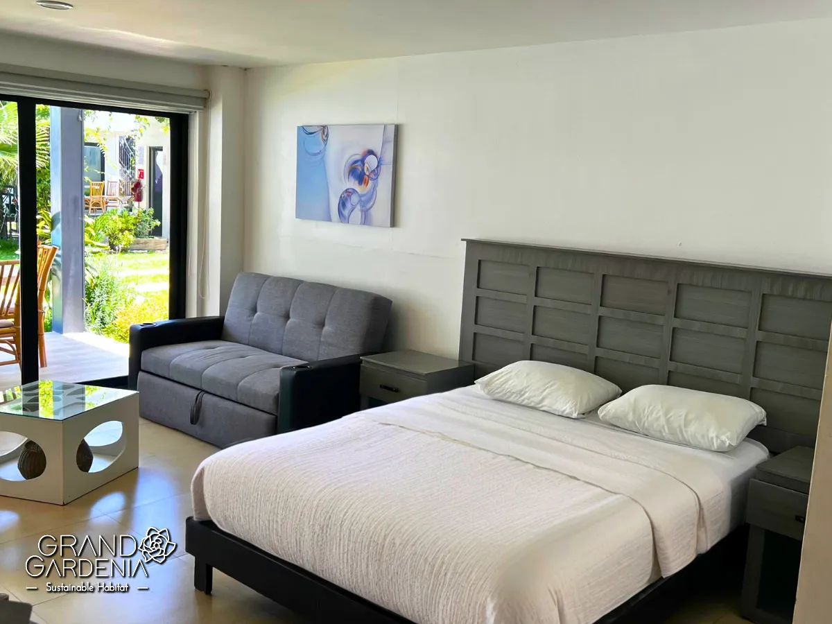 Villa acogedora en planta baja de 45 m², dispone de una habitación con cama queen size, un cómodo sofá cama en la zona de estar, baño privado y balcón o terraza con zona de comedor, ideales para relajarse y disfrutar del entorno natural.